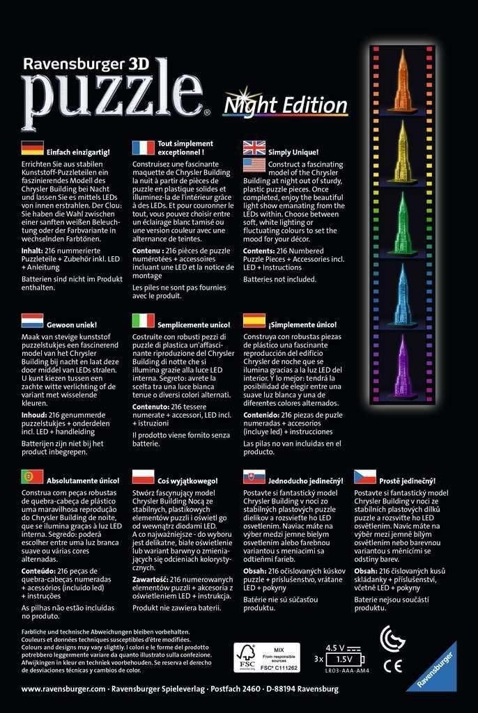 El Ravensburger Chrysler Building Night Edition es un rompecabezas tridimensional que permite construir una réplica iluminada del icónico rascacielos de Nueva York. Con luces LED que cambian de color y un diseño detallado, este rompecabezas combina entretenimiento, creatividad y elegancia para disfrutar en familia.